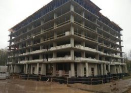 На стройплощадке первого корпуса ЖК «Олимп» стартовали работы по обустройству каменной кладки. На текущий момент дом возведен до восьмого этажа, где осуществляется заливка колонн первой и второй секции.